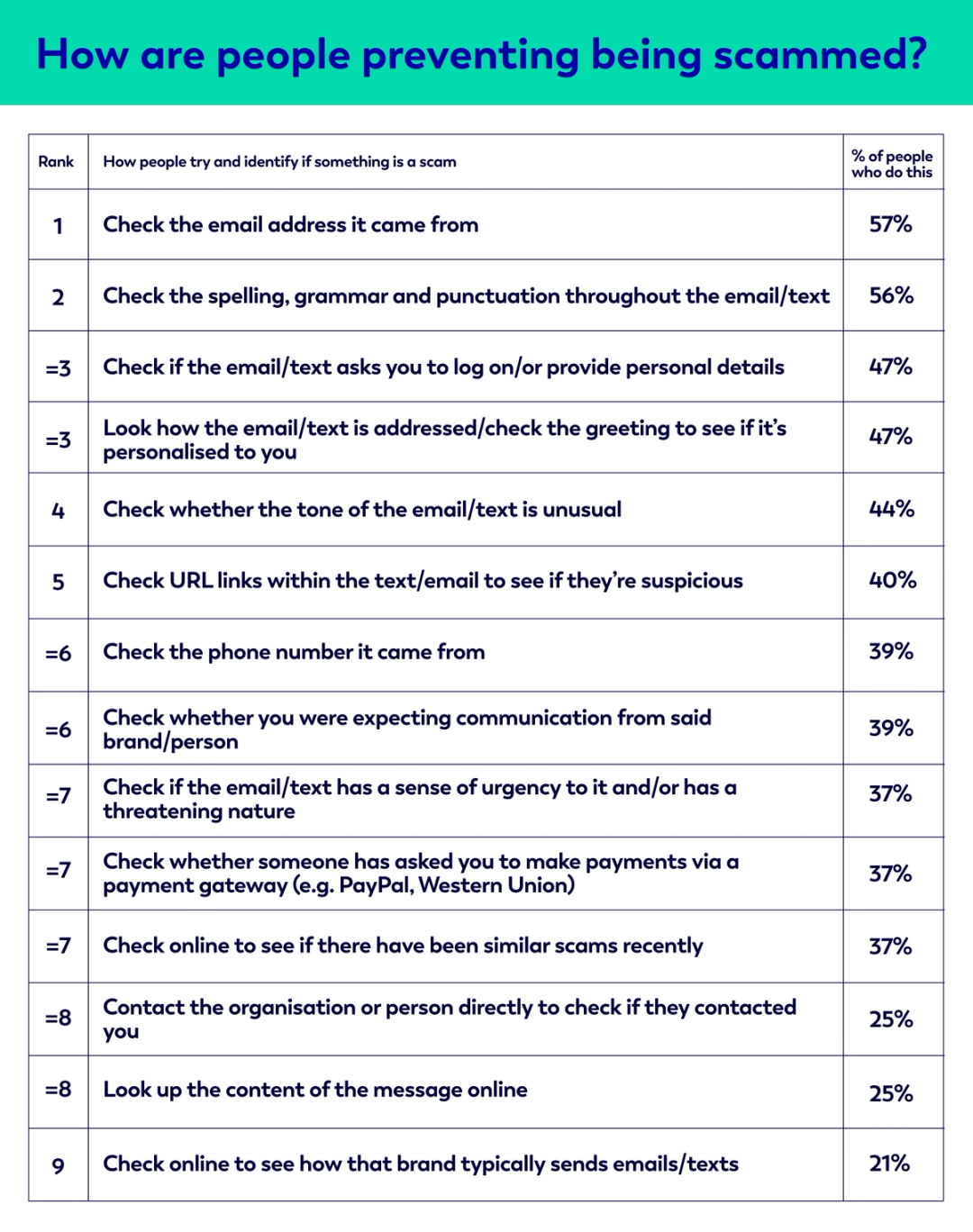 Our survey revealed the various ways that people around the UK identify and prevent scams, showing key strategies that help reduce the risk of falling victim to fraud. Here's a look at the most common tactics people rely on to safeguard their information: